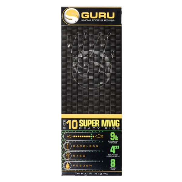 De Guru Super MWG Ready Rigs zijn kant-en-klare onderlijnen die perfect geschikt zijn voor het vissen met de methodfeeder. Deze onderlijnen zijn voorzien van een weerhaakloze Super MWG haak en ze zijn gemaakt van Guru N-Gauge lijn. Daarnaast beschikken de Super MWG Ready Rigs over een hair met een lusje, hierdoor zijn ze geschikt voor veel soorten haakaas.