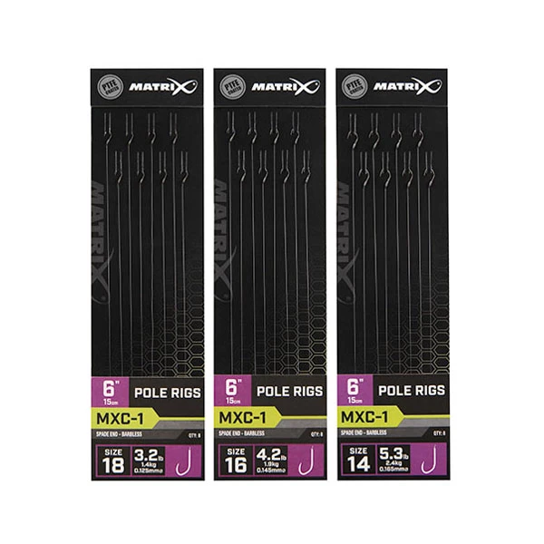 De Matrix MXC-1 Pole Rigs zijn speciaal ontworpen voor het vissen met de vaste hengel op commercials, maar kunnen natuurlijk ook op andere wateren gebruikt worden. Deze onderlijnen lenen zich perfect voor het vissen met pellets, maden en mais. De Matrix MXC-1 Pole Rigs zijn voorzien van gecoate en weerhaakloze Matrix MXC-1 haken en geknoopt van Matrix Micron nylon lijn.